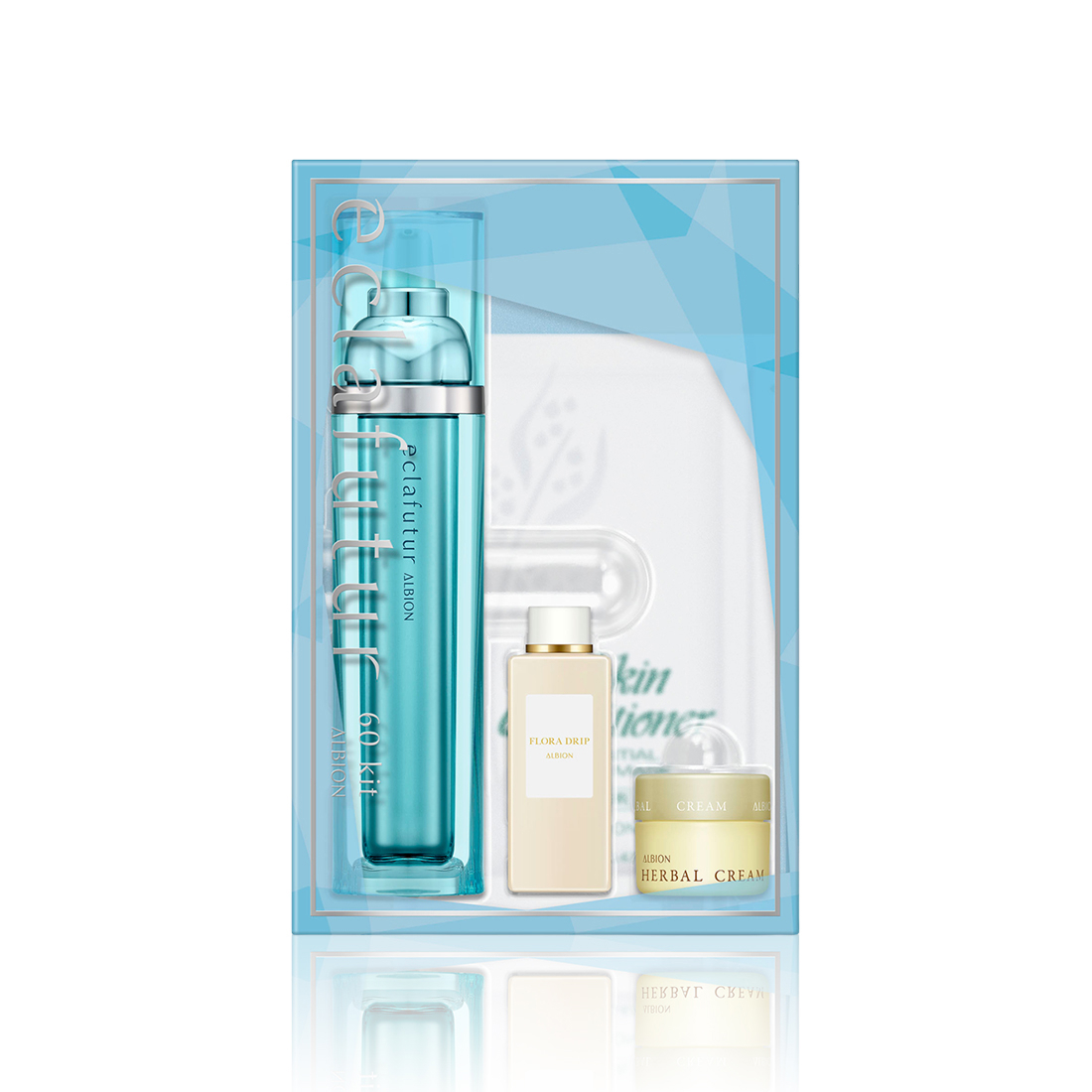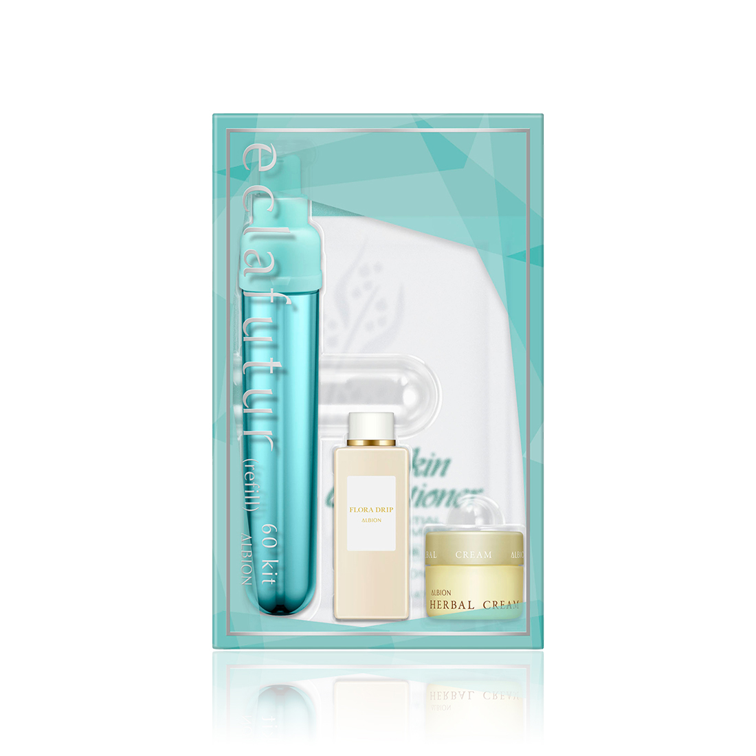 エクラフチュール t60mlの本体とレフィルが選べる!フローラドリップ s、スキコンマスク、ハーバルクリームなどアルビオンを代表するアイテムを同時に試せるスペシャルキットです。