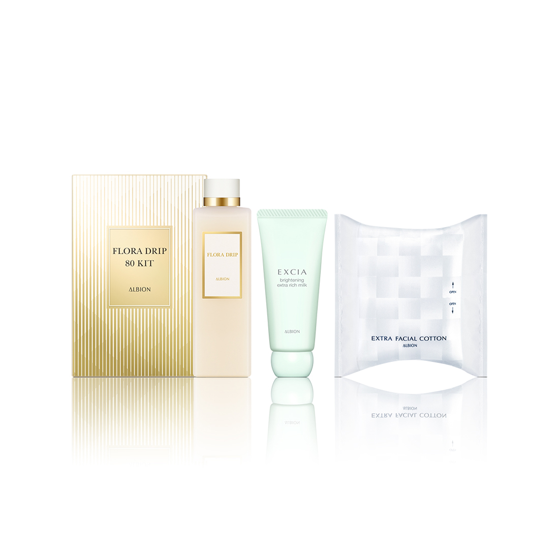 はじめやすい!アルビオン フローラドリップ s 80mlと、輝きと美白を追求するエクシア ブライトニングの美白乳液・コットンがセットになったスペシャルキットです。