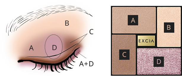 - ④ 下まぶたは、Aを目尻側4/5にひろげ、上からDを重ねる。